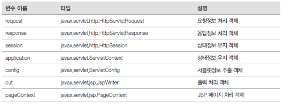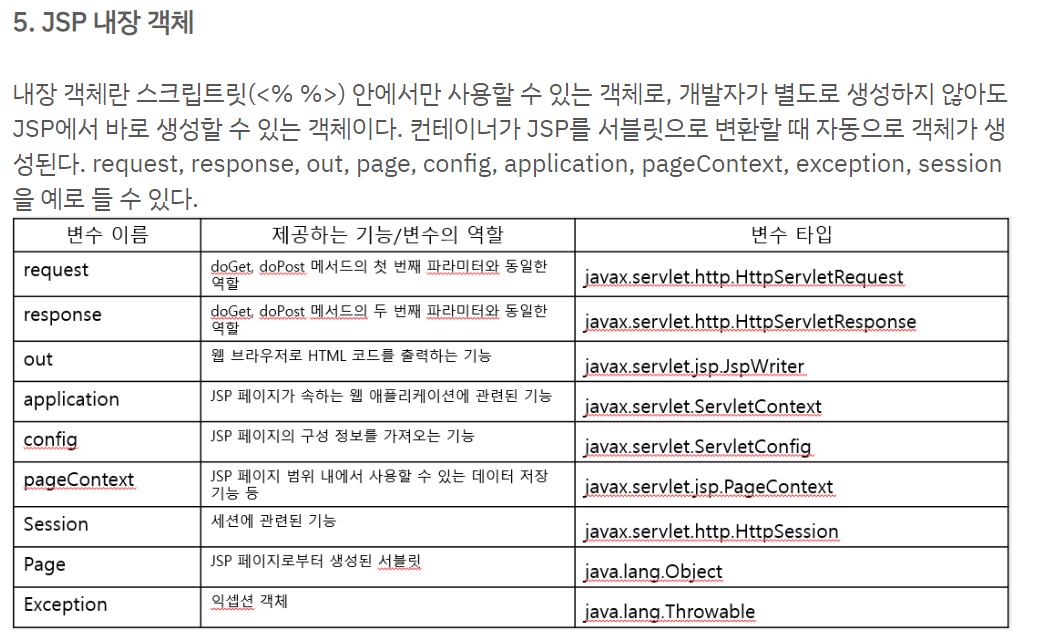 아까 JSP파일이 Servlet코드로 변환된 것으로 보면 위의 HttpSession, ServletContext등등이 다 선언되어 있는 것을 알 수 있다. 그렇기 때문에 사용할 수 있는 것이다. (동적이 코드이기 때문에 서버에서 처리를 해줄거기 때문이다) 따라서 내장객체이기 때문에 위에 선언되어 있는 것들은 다 사용할 수 있다고 생각하면 된다.