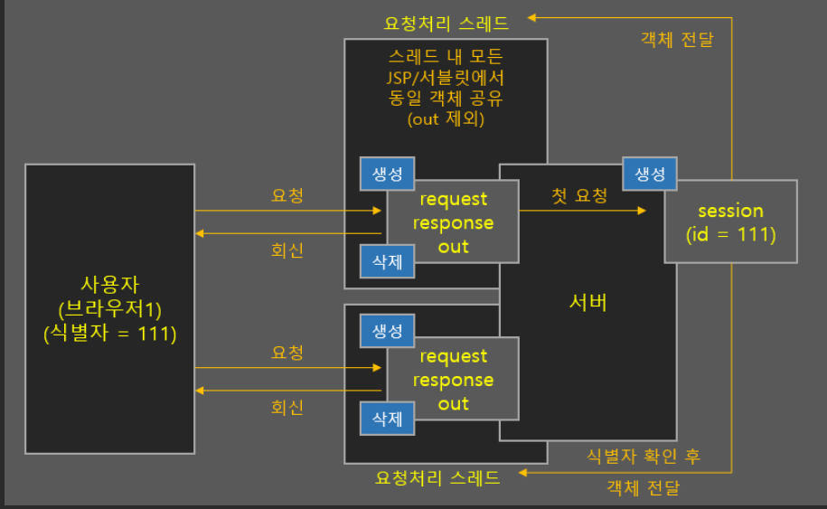 컨테이너가 JSP를 서블릿으로 변환할 때 자동으로 객체가 생성됨