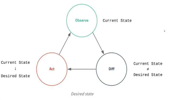 - 현재 상태(current state) 를 모니터링하면서 관리자가 설정한 원하는 상태(desired state)를 유지하는 방향으로 동작